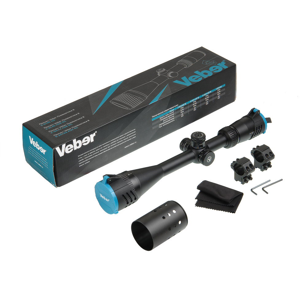 Veber Пневматика II 6-24х44 AOE RG – светосильный прицел нового поколения для мощных пневматических винтовок с энергией выстрела до 25 Дж. Может устанавливаться на арбалеты, оружие для страйкбола и пейнтбола. Изменяемая кратность прицела позволяет успешно вести стрельбу как на ближних, так и на дальних дистанциях, использовать его, например, и для плинкинга, и для бенчреста.